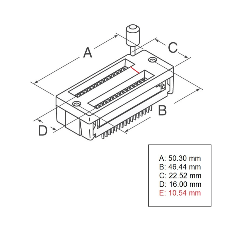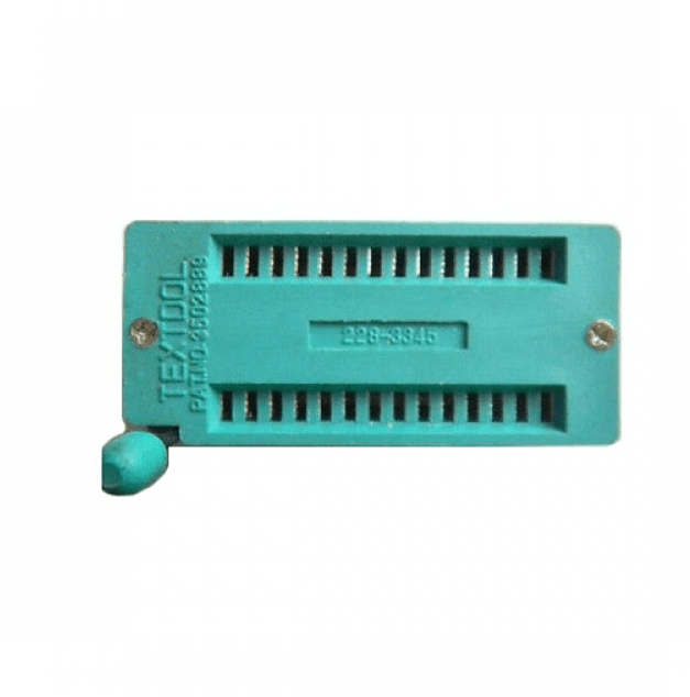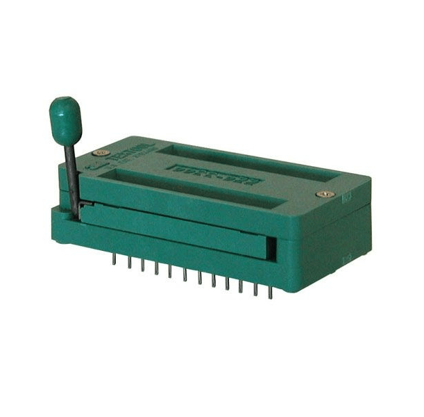 28 Pin ZIF Socket is a type of IC socket or electrical connector that requires very little to no force for insertion. This is often used when there is a need to program or test the chip, without damaging the chip. The socket has a lever which when moved up open the clamps for the pins to be inserted. The weight of the IC itself is sufficient enough for the IC to be in place. When the lever is moved down, the clamps in the socket latch onto the pins of the IC to lock it in place.