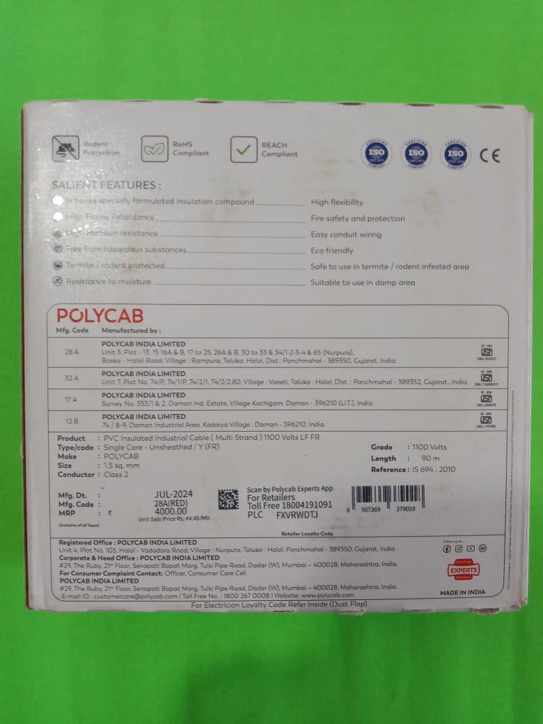 Product Description: The Polycab 1.5 MM PVC Insulated Industrial Cable is built for industrial strength and reliability. Designed with multi-strand unsheathed construction, this cable ensures robust performance with a voltage grade of 1100 volts. Its 1.5 SQ. MM size and 90-meter length provide excellent conductivity and ease of installation, perfect for both industrial and commercial applications.