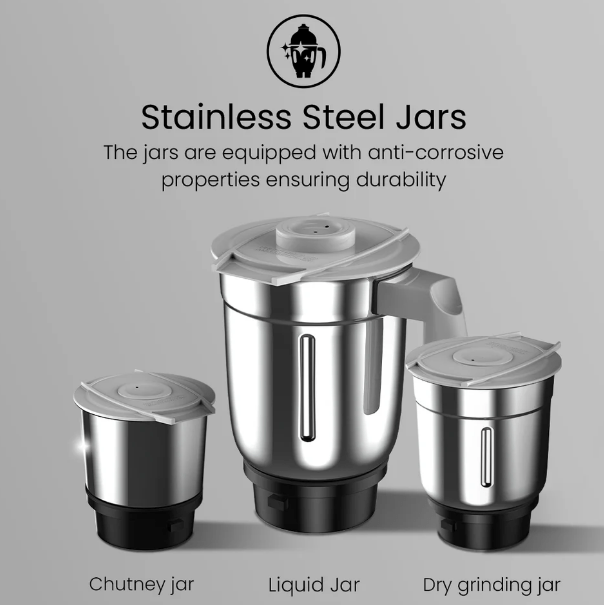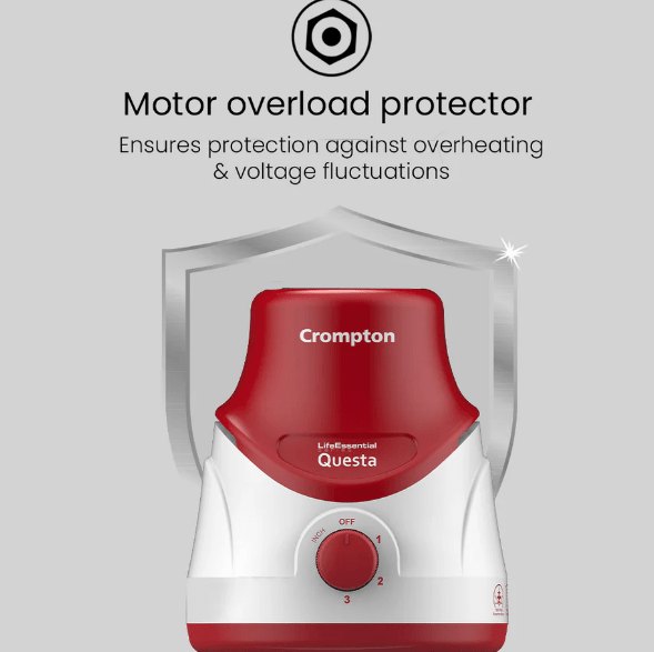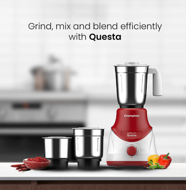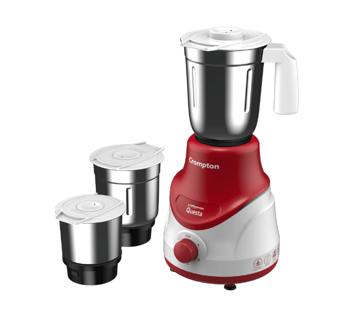 For an outstanding gridning experience get the Crompton Questa Dlx Mixer Grinder that grinds heavy duty items with ease. The Mixer Grinder that enhances your kitchen comes with Motor Vent-X Technology to ensure better air circulation & motor ventilation, generating less heat for longer motor life. Get ready to whip up tasty smoothies, finely ground masalas, tangy chutneys, chopped vegetables, and much more in a flash. Your safety and comfort is our priority which is why the grinder is secured with overload protection & 3x speed in-built pulse switch. The product also comes with three corrosion & leakage-free Stainless Steel jars.