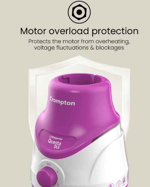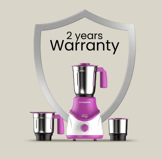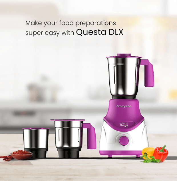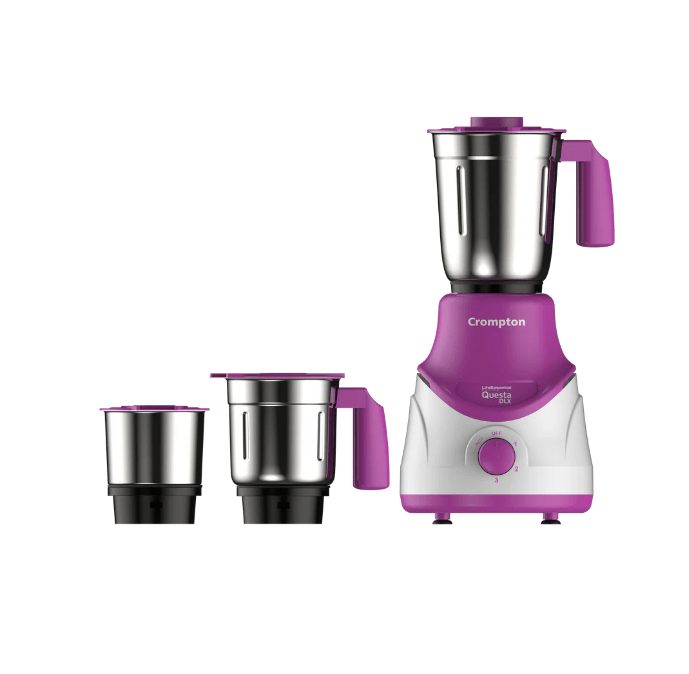 For an outstanding gridning experience get the Crompton Questa Dlx Mixer Grinder that grinds heavy duty items with ease. The Mixer Grinder that enhances your kitchen comes with Motor Vent-X Technology to ensure better air circulation & motor ventilation, generating less heat for longer motor life. Get ready to whip up tasty smoothies, finely ground masalas, tangy chutneys, chopped vegetables, and much more in a flash. Your safety and comfort is our priority which is why the grinder is secured with overload protection & 3x speed in-built pulse switch. The product also comes with three corrosion & leakage-free Stainless Steel jars.