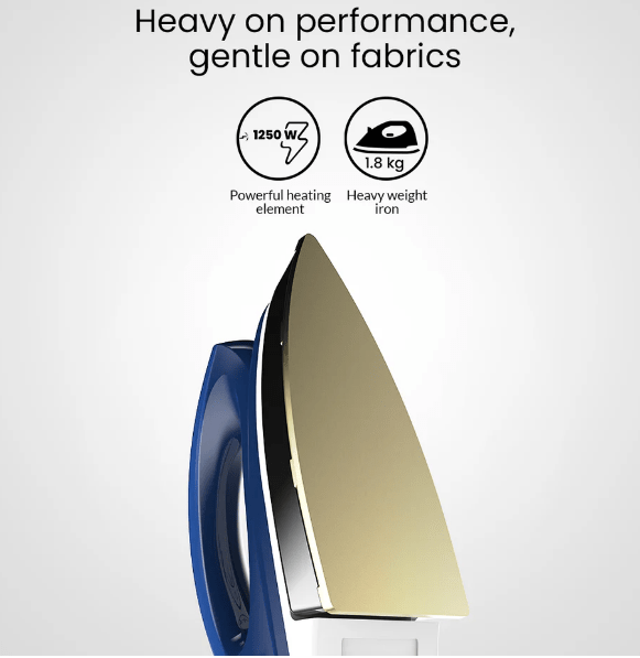 Introducing Rhino Plus, a high-quality iron with a 2 year warranty for added peace of mind. With a powerful 1250W heating element, this iron will quickly and efficiently smooth out any wrinkles. The golden American Heritage coating ensures a smooth and easy glide over almost any fabric, and the 6 fabric settings make it easy to choose the right temperature for any type of clothing.The iron has a heavy weight body at 1.8 Kg which helps in the removal of tough wrinkles and gives perfect results every time.