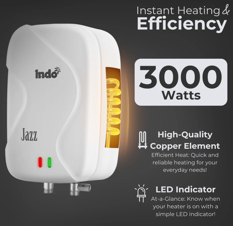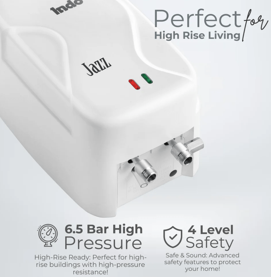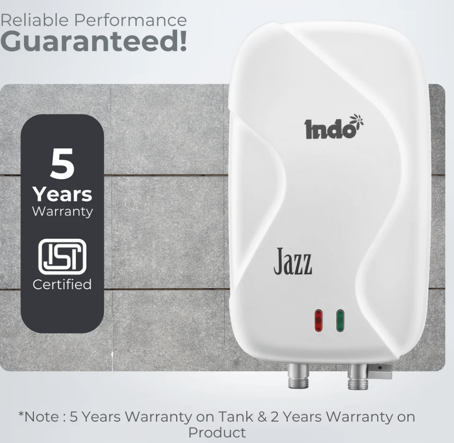 Looking for an instant water heater that checks all the boxes? Meet your new best friend in the bathroom and kitchen—Indo Instant Water Geyser! With a powerful 3000W heating element, you’ll enjoy fast, efficient hot water at the turn of a tap. Our SS 304 Stainless Steel Tank and Anti-Rust Coating ensure durability and performance, while the 6.5-bar pressure capability makes it perfect for high-rise living. Safety is paramount, with features like 4-Level Advanced Safety, a Thermal Cutout, and a Safety Valve to keep your home protected. And with a 5-year tank warranty and a 2-year element warranty, you’re investing in a product backed by 43 years of trust and proudly made in India. Choose Indo for an instant water heating experience like no other!