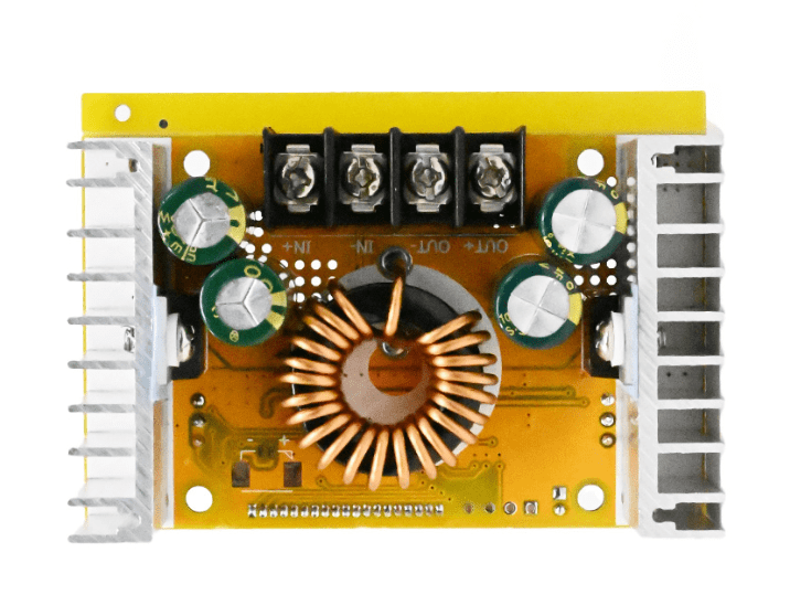This is an LM2596 DC-DC buck converter step-down power module with the high-precision potentiometer, capable of driving a load up to 3A with high efficiency, which can work with Freeduino UNO, other mainboards, and basic modules. When the output current keeps greater than 2.5A (or output power greater than 10W), please add a heat sink to it.