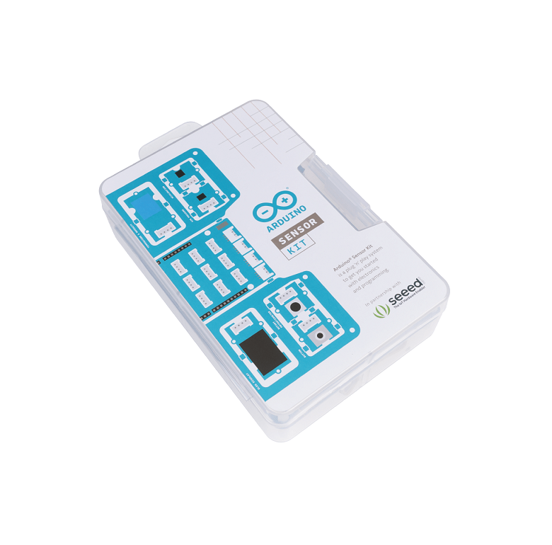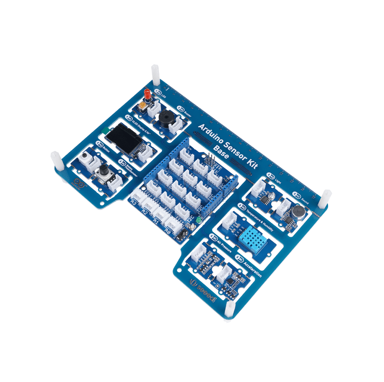 Official Arduino Sensor Kit is a joint production between the Arduino and Seeed, which has a dual trademark of Arduino and Seeed. It has 1o Grove modules and one grove based shield on a single PCB board. All these modules and base shields are connected through the PCB tracks, which means that you only need to plug the Arduino Sensor Kit into the Arduino UNO board.